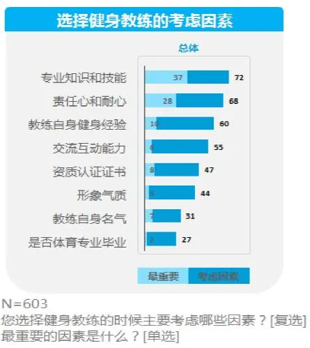 随着健身知识的普及,健身会员对于自己的健身需求相比从前更加的细化、明确,更了解所需要的教练类型和所需提供的服务。在选择教练的考虑因素上,健身会员比较看重教练的专业知识和技能以及教练的责任心/耐心。