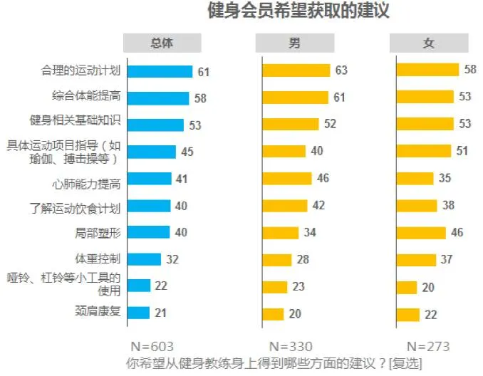 另外,男性和女性会员对于希望从健身教练身上获取的信息和建议侧重点会有所不同,男性更看重合理的运动计划,综合体能提高和心肺能力的提高建议,而女性更关注一些具体项目的指导,塑形及体重控制方面的内容。