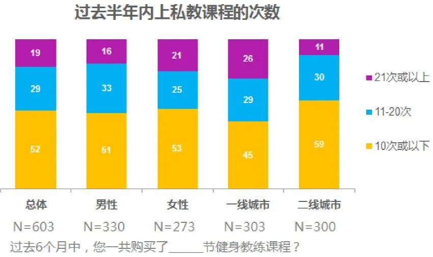 另外,一线城市的健身会员上私教课程的次数(平均半年内19次)也远远高于二线城市会员(平均半年内12次),有1/4的一线城市被访者在过去半年内上过超过20次私教课程(二线城市仅为11% )。