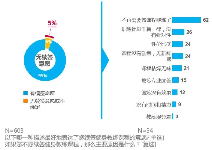 对于不再续签的健身会员,主要都是认为“不再需要该课程的锻炼了”。健身会员掌握了锻炼方法或已见成效时,健身教练的重要性就降低了。为了提高健身会员的粘性,教练需要为健身会员在不同健身阶段提供不同的健身计划,挖掘会员新的需求,让健身会员感知到健身是一个比较系统和循序渐进的过程,在每个阶段都需要健身教练的指导。