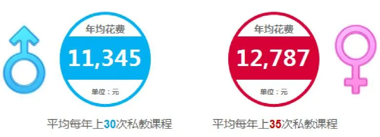 虽然男性去健身房锻炼和频率和时长都比女性高,但是女性健身会员在健身方面的支出相对更高,达到12,787元(男性为11,345元),主要是由于她们上私教课程的次数更多(平均每年35次,而男性平均每年上30次)。