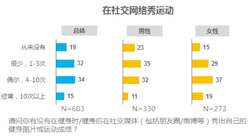 有81%的健身会员曾经在朋友圈或微博等社交网络,秀出自己的健身照片或者运动成绩,尤其是女性健身者(这一比例达到85%),有大约1/5的女性健身会员表示经常在朋友圈等社交网络秀出自己运动的照片或成绩超过10次。