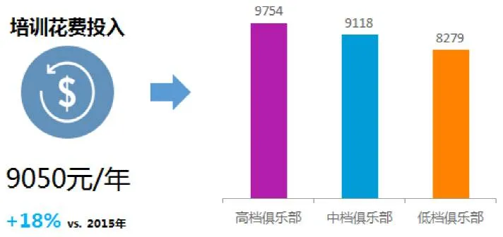 在职业技能的提高上,健身教练平均每年会在继续深入学习专业知识方面投入9050元,其中高档俱乐部任教的教练投入更高(接近1万元)。