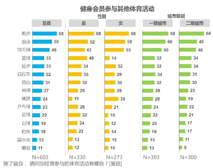 除了健身房运动以外,跑步、羽毛球和游泳这三项运动的参与比例最高。其中,篮球和足球这些对抗性运动在男性当中的参与比例也很高,而跳舞和羽毛球这些相对温和的运动项目在女性当中的参与比例相对较高。