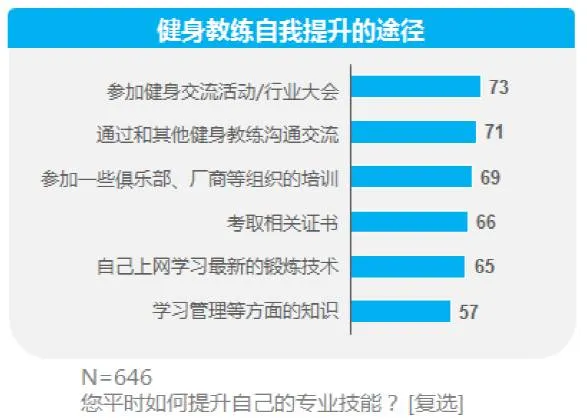 健身教练主要通过参加健身交流活动/行业大会以及跟其他教练的沟通交流进行自我提升,此外,参加俱乐部和厂商的培训也是主要手段之一。