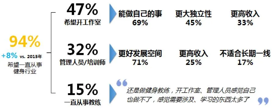 94%的健身教练愿意考虑把教练职业当作长期职业(该比例较去年高8%)47%表示在未来会考虑成立健身机构,认为创业能让自己做想做的事情,有更大的独立性。32%的教练为了更好的发展空间,希望以后成为俱乐部的管理人员或培训师。也有巧%的教练觉得自己只能一直从事健身教练。总的来说,健身教练行业钻性度有所增加,健身教练有明确的职业发展预期对自我提升、自由度有要求。