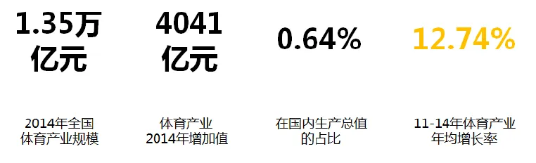 近年来体育产业规模稳步增长,2011年到2014年体育产业年均增长率为12.74%。2014年全国体育产业规模达1.35万,占国内生产总值的0.64%,比2013年增长4041亿元,增幅显著。根据《体育产业发展十三五规划》,体育产业得快速发展将成为国民经济新兴产业的巨大潜力,为体育产业发展提供有利的条件。