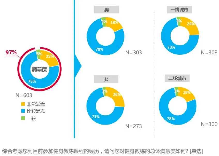 健身会员对教练的整体满意度比较高,对教练非常满意占3/4,比物茜意的比例约占22%,其中女性会员和一线城市会员对健身教练满意度相对更高。