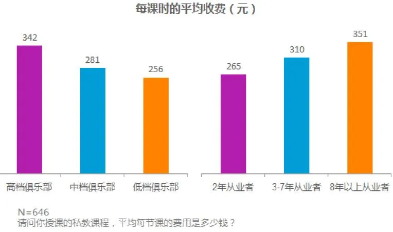 教练授课的学费,既跟他们所任在的俱乐部档次有关,也跟他们从业的资历相关。健身教练平均每课时的收费是290元,其中高档俱乐部的均价为342元,而低档俱乐部的收费为256元。另外,8年以上的从业者平均课时单价达到了351元,而从业资历在2年以内的教练授课均价为265元。