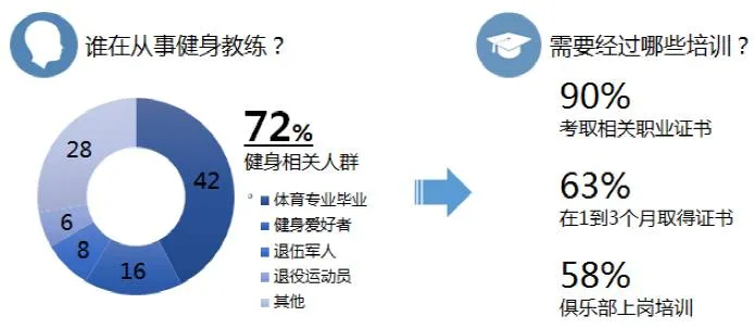 大部分健身教练在入行之前的经历都与体育相关,42%是体育专业毕业的,还有28%是健身爱好者。他们当中有90%在入行之前考取了相关的职业证书,其中63%的人为职业证书准备了1-3个月的时间。也有58%的人通过了俱乐部的上岗培训才入职。