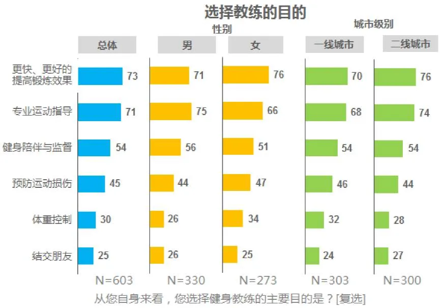 健身会员选择健身教练的需求比较明确,主要是为了“更快、更好的提高锻炼效果”和“专业运动指导”,男性健身会员更关注后者而女性会员更关注前者。另外,女性会员对于”体重控制“也有格外的关注。