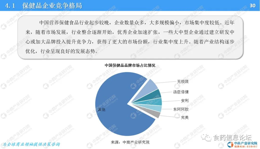 中国营养保健食品行业起步较晚,企业数量众多,大多规模偏小,市场集中度较低。近年来,随着市场发展,行业整合逐渐开始,优秀企业加速扩张,一些大中型企业通过建立研发中心或加大品牌投入提升竞争力,获得了更大的市场份额,行业集中度上升。随着产业结构逐步优化,行业呈现良好的发展态势。