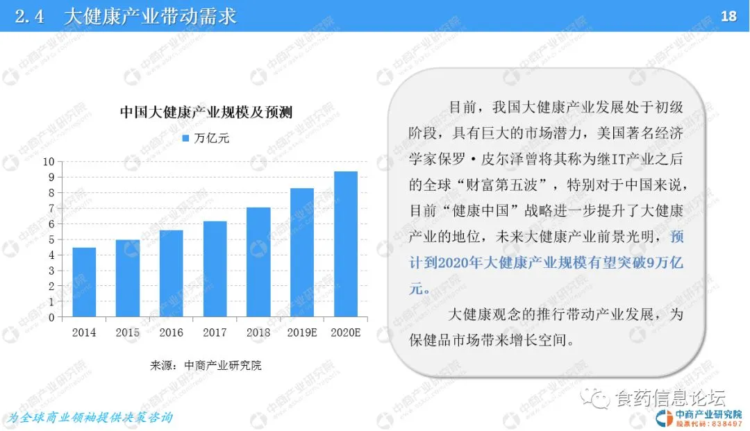 其中,我国大健康产业发展处于初级阶段,具有巨大的市场潜力,美国著名经济学家保罗·皮尔泽曾将其称为继IT产业之后的全球“财富第五波”,特别对于中国来说,目前“健康中国”战略进一步提升了大健康产业的地位,未来大健康产业前景光明,预计到2020年大健康产业规模有望突破9万亿元。大健康观念的推行带动产业发展,为保健品市场带来增长空间。