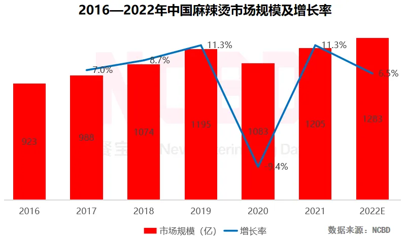 1、NCBD(餐宝典)数据显示,2021年中国麻辣烫市场规模突破1200亿元,预计2022年将会达到1283亿元