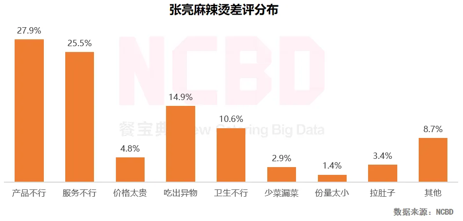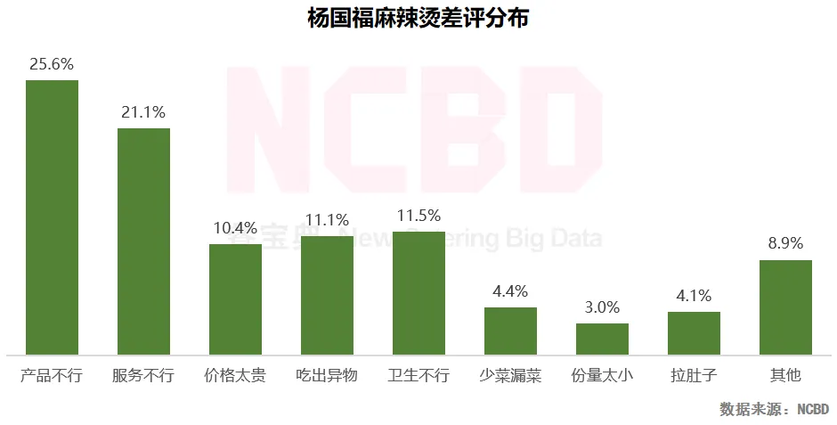 3、杨国福麻辣烫:在产品方面,杨国福麻辣烫收获了超过1/4的差评;另外,吃出异物与环境卫生问题等也较为典型。不过与其他品牌相比,杨国福的问题较为“均衡”