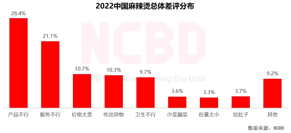 1、从麻辣烫的差评分布来看,除产品与服务方面的问题外,价格、吃出异物以及卫生等方面的差评占比也较高,由此也能看出该行业存在的问题