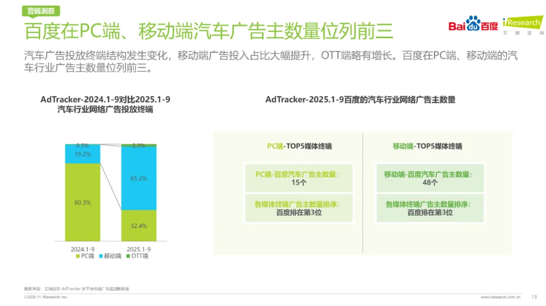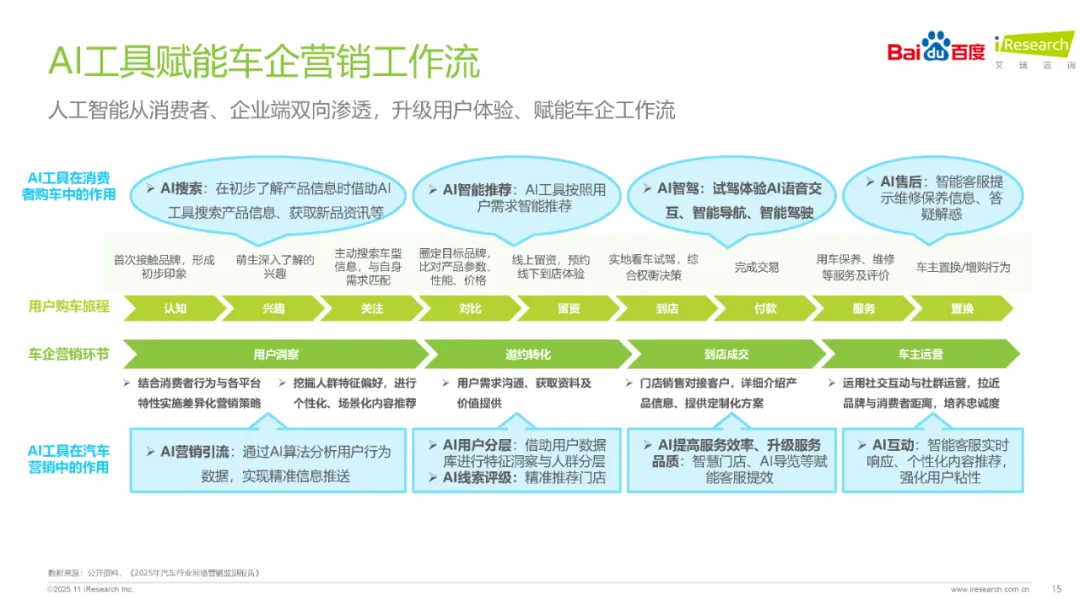 百度作为全球最大的中文搜索引擎,其汽车生态在2025年实现了全面AI化。报告指出,百度通过AI内化升级,构建了内外双生态经营管理体系,以用户为中心构建长期信任价值。从AI品牌流量阵地到AI内容矩阵生态,再到AI经销商转化体系,百度正以AI技术为核心,打造汽车智能化营销的新体系。