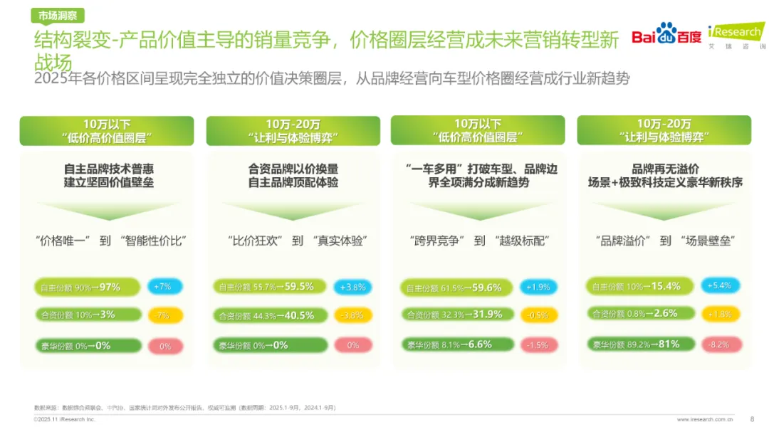 新能源技术的规模化应用与成本下降,彻底改变了汽车市场的价格体系。报告显示,2025年各价位区间市场经历了“性价比重构”,产品价值取代品牌符号成为用户决策的关键因素。新能源车型在30万以下市场成为核心增量板块,而合资/豪华品牌则面临以价换量的困境,销量下滑趋势明显。