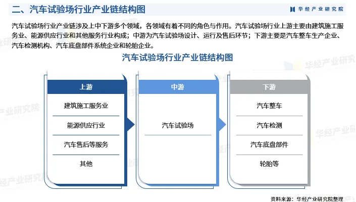 汽车试验场行业产业链涉及上中下游多个领域,各领域有着不同的角色与作用。汽车试验场行业上游主要由建筑施工服务业、能源供应行业和其他服务行业构成;中游为汽车试验场设计、运行及售后环节;下游主要是汽车整车生产企业、汽车检测机构、汽车底盘部件系统企业和轮胎企业。