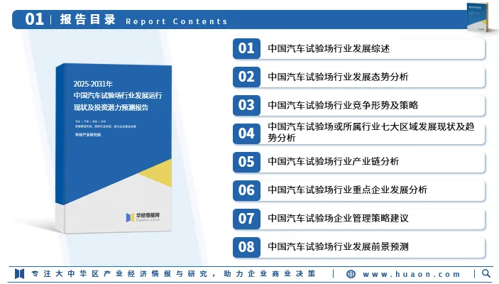《2025-2031年中国汽车试验场行业发展运行现状及投资潜力预测报告》对汽车试验场行业发展环境、市场运行现状进行了具体分析,还重点分析了行业竞争格局、重点企业的经营现状,结合汽车试验场行业的发展轨迹和实践经验,对未来几年行业的发展趋向进行了专业的预判。是企业、科研、投资机构等单位了解行业最新发展动态及竞争格局,把握行业未来发展方向、提高企业经营效率、做出正确经营决策不可或缺的重要工具。