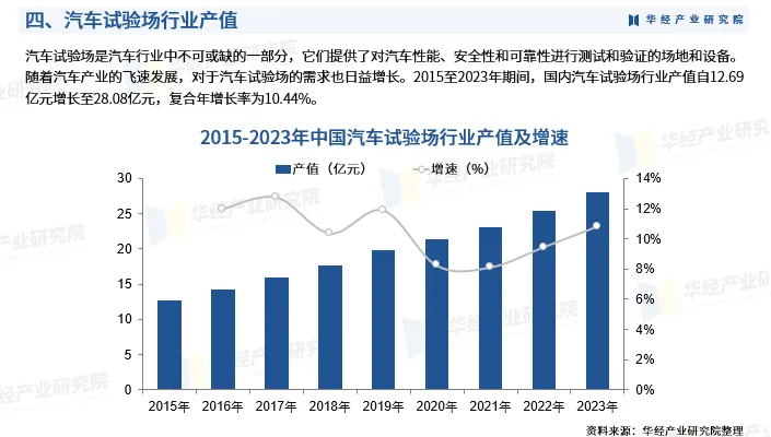 汽车试验场是汽车行业中不可或缺的一部分,它们提供了对汽车性能、安全性和可靠性进行测试和验证的场地和设备。随着汽车产业的飞速发展,对于汽车试验场的需求也日益增长。2015至2023年期间,国内汽车试验场行业产值自12.69亿元增长至28.08亿元,复合年增长率为10.44%。