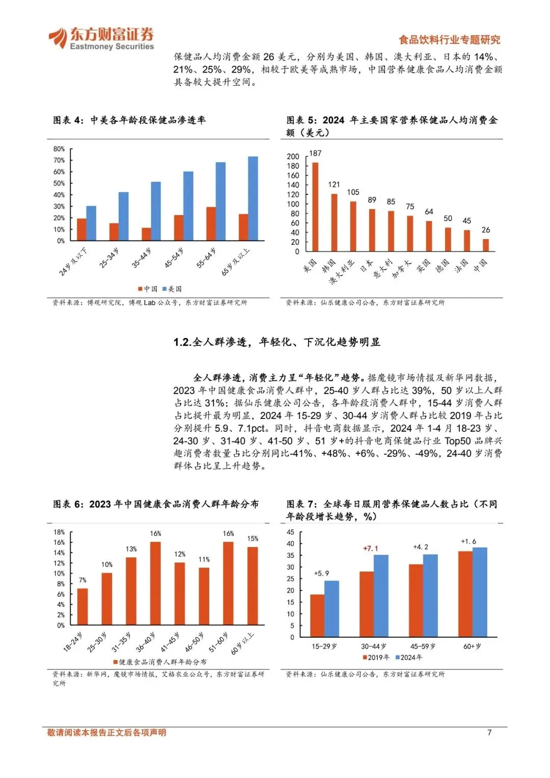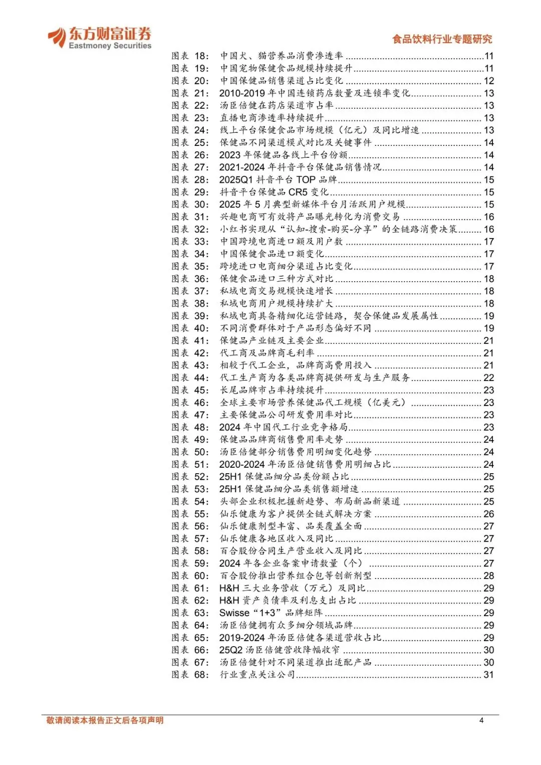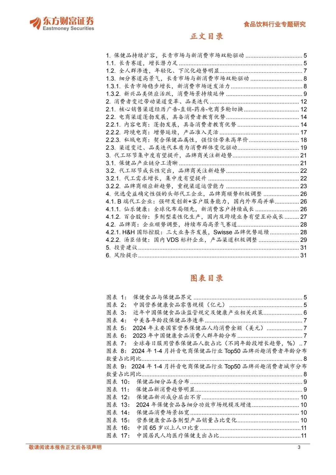 ☝扫码加入会员,海量优质报告下载无限制。报告每日更新,覆盖各行业,查找起来省时省力~⭕关注公众号并回复“营销资料”,可免费获取新人资源礼包1份!保健品持续扩容,长青市场与新消费市场双轮驱动。2024年中国营养健康食品零售规模达2602亿元,2019-2024年CAGR达6.3%;中国保健品渗透率具备充足提升空间,2024年中国保健品人均消费金额26美元,仅为美国、韩国、澳大利亚、日本的14%、21%、25%、29%。目前保健品市场呈现长青市场与新消费市场双轮驱动的特点,长青市场头部品牌生命周期长、消费需求持续演变;而新消费市场在消费群体年轻化、消费需求悦己化等趋势下快速成长,美容抗衰等品类维持较高增速、产品形态偏向于零食化剂型,同时抖音电商、山姆等新零售渠道、私域电商等快速崛起。展望未来,保健品全人群渗透、营养健康重视程度提升下,保健品消费需求有望持续成长。消费者变迁带动渠道变革、品类迭代。中国保健品主要销售渠道经历直销—药房—电商多轮切换,2023年保健品直销/药店/电商/其他渠道占比分别为24.01%/19.83%/48.02%/8.14%,相较于2012年分别同比-18.9/-8.2/+32.96/-5.9pct。2020年9月起我国明确规定医保禁止刷保健品,线下药房渠道受损。直播电商的发展持续驱动保健品行业成长,2024年直播电商渗透率达34.3%。同时,以抖音为代表的内容电商在消费者教育及消费者转化方面具备优势,呈现高增长、长尾效应明显的特点:2022、2023、2024年抖音平台保健品销售额增速分别为227.47%、87.11%、52.54%,新兴品牌如诺特兰德、五个女博士快速崛起,抖音电商保健食品CR5从2022H1的29.8%下滑至2024年的16.8%。跨境电商在产品准入机制及进口模式上较为灵活,2024年中国保健食品跨境进口总额增速达15%,其中抖音全球购、拼多多全球购等成长为跨境电商主流渠道。保健品渠道变革及品类迭代本质由消费群体变化推动,当前保健品全人群渗透,呈现日常化、悦己化需求,进而导致消费者需求呈现多元化,企业也顺势调整经营策略。代工环节集中度有望提升,品牌商关注新趋势。2024年中国营养保健品代工规模约34亿美元,预计2027年达40亿美元,2024-2027年CAGR达5.0%。从保健品细分产业链来看,代工环节有望持续受益于保健品稳定的需求增长、同时在新消费趋势驱动下,新兴初创品牌多为轻资产运营、自建厂房规模不经济,长尾品牌的持续涌入有望支撑保健品代工需求增长。2024年仙乐健康、百合股份代工业务市占率约为7%、3%,预计在政策逐步规范、品牌商对代工企业生产及服务能力要求提升下,代工环节有望进一步向头部企业集中。品牌商目前积极顺应产品渠道趋势,如企业积极布局美容抗衰等产品,营销、渠道及品牌打造等品牌运营能力或为企业占领消费者心智从而实现突围的关键。优选受益确定性强的头部代工企业,品牌商顺势积极调整。仙乐健康具备全球化产能布局,中国区全面发力新消费市场,国际业务中欧洲区、亚太与新兴市场表现亮眼,同时美洲区域在关税扰动下仍然保持增长势头、BF积极提升运营效率;百合股份多剂型+柔性化生产优势突出、蓝帽子数量领先,可快速响应下游客户需求,公司海外工厂落地有望进一步在客户协同下享受跨境成长红利。品牌商在新品类、新渠道变革下积极拥抱新趋势,其中H&H国际控股核心业务持续改善,成人营养品牌Swisse在线上各渠道表现强劲、“1+3”品牌战略下有望持续享受保健品渗透率提升红利;汤臣倍健积极调整,针对线上线下渠道推出适配产品,25Q2以来营收降幅收窄,后续在产品和渠道调整下有望逐步改善。?️扫码加入知识星球,可查看更多"保健品"相关研报~