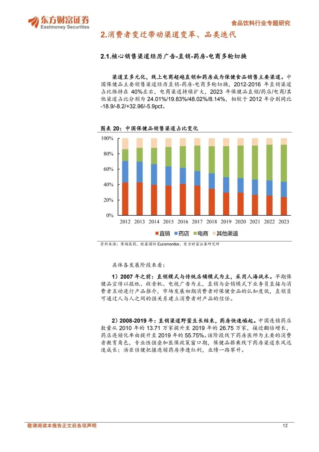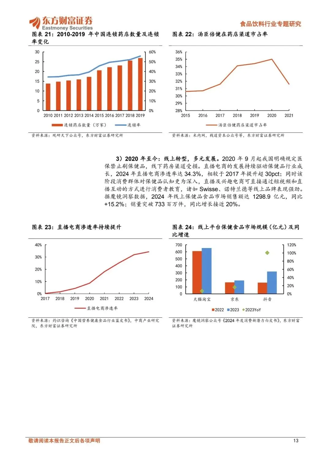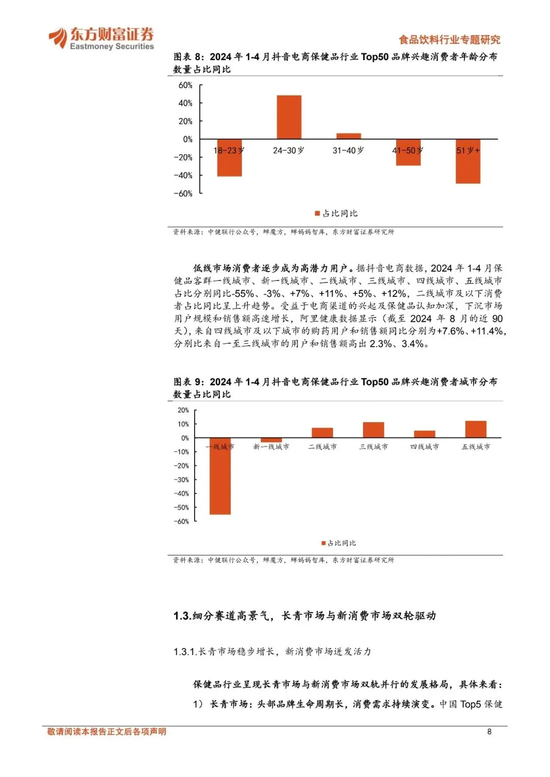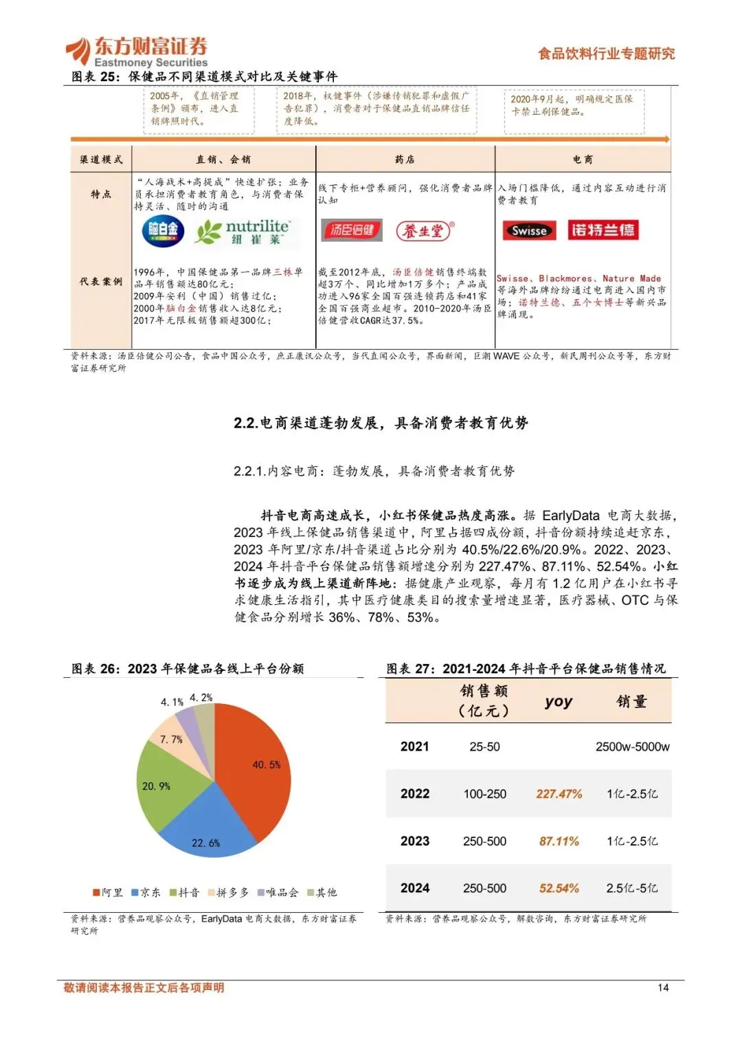☝扫码加入会员,海量优质报告下载无限制。报告每日更新,覆盖各行业,查找起来省时省力~⭕关注公众号并回复“营销资料”,可免费获取新人资源礼包1份!保健品持续扩容,长青市场与新消费市场双轮驱动。2024年中国营养健康食品零售规模达2602亿元,2019-2024年CAGR达6.3%;中国保健品渗透率具备充足提升空间,2024年中国保健品人均消费金额26美元,仅为美国、韩国、澳大利亚、日本的14%、21%、25%、29%。目前保健品市场呈现长青市场与新消费市场双轮驱动的特点,长青市场头部品牌生命周期长、消费需求持续演变;而新消费市场在消费群体年轻化、消费需求悦己化等趋势下快速成长,美容抗衰等品类维持较高增速、产品形态偏向于零食化剂型,同时抖音电商、山姆等新零售渠道、私域电商等快速崛起。展望未来,保健品全人群渗透、营养健康重视程度提升下,保健品消费需求有望持续成长。消费者变迁带动渠道变革、品类迭代。中国保健品主要销售渠道经历直销—药房—电商多轮切换,2023年保健品直销/药店/电商/其他渠道占比分别为24.01%/19.83%/48.02%/8.14%,相较于2012年分别同比-18.9/-8.2/+32.96/-5.9pct。2020年9月起我国明确规定医保禁止刷保健品,线下药房渠道受损。直播电商的发展持续驱动保健品行业成长,2024年直播电商渗透率达34.3%。同时,以抖音为代表的内容电商在消费者教育及消费者转化方面具备优势,呈现高增长、长尾效应明显的特点:2022、2023、2024年抖音平台保健品销售额增速分别为227.47%、87.11%、52.54%,新兴品牌如诺特兰德、五个女博士快速崛起,抖音电商保健食品CR5从2022H1的29.8%下滑至2024年的16.8%。跨境电商在产品准入机制及进口模式上较为灵活,2024年中国保健食品跨境进口总额增速达15%,其中抖音全球购、拼多多全球购等成长为跨境电商主流渠道。保健品渠道变革及品类迭代本质由消费群体变化推动,当前保健品全人群渗透,呈现日常化、悦己化需求,进而导致消费者需求呈现多元化,企业也顺势调整经营策略。代工环节集中度有望提升,品牌商关注新趋势。2024年中国营养保健品代工规模约34亿美元,预计2027年达40亿美元,2024-2027年CAGR达5.0%。从保健品细分产业链来看,代工环节有望持续受益于保健品稳定的需求增长、同时在新消费趋势驱动下,新兴初创品牌多为轻资产运营、自建厂房规模不经济,长尾品牌的持续涌入有望支撑保健品代工需求增长。2024年仙乐健康、百合股份代工业务市占率约为7%、3%,预计在政策逐步规范、品牌商对代工企业生产及服务能力要求提升下,代工环节有望进一步向头部企业集中。品牌商目前积极顺应产品渠道趋势,如企业积极布局美容抗衰等产品,营销、渠道及品牌打造等品牌运营能力或为企业占领消费者心智从而实现突围的关键。优选受益确定性强的头部代工企业,品牌商顺势积极调整。仙乐健康具备全球化产能布局,中国区全面发力新消费市场,国际业务中欧洲区、亚太与新兴市场表现亮眼,同时美洲区域在关税扰动下仍然保持增长势头、BF积极提升运营效率;百合股份多剂型+柔性化生产优势突出、蓝帽子数量领先,可快速响应下游客户需求,公司海外工厂落地有望进一步在客户协同下享受跨境成长红利。品牌商在新品类、新渠道变革下积极拥抱新趋势,其中H&H国际控股核心业务持续改善,成人营养品牌Swisse在线上各渠道表现强劲、“1+3”品牌战略下有望持续享受保健品渗透率提升红利;汤臣倍健积极调整,针对线上线下渠道推出适配产品,25Q2以来营收降幅收窄,后续在产品和渠道调整下有望逐步改善。?️扫码加入知识星球,可查看更多"保健品"相关研报~