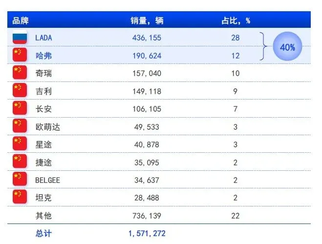 在2022年以前,俄罗斯新车市场长期由欧洲、韩国和日本品牌主导,其市场份额一度接近70%。俄乌冲突和制裁爆发后,上述车企大多停产或退出,留下巨大的市场空缺。AUTOSTAT、金融时报和Business Insider等多方统计表明,中国品牌在2023年快速填补缺口,市场份额从2021年的个位数跃升至2023年的约50%,2024年进一步升至57–63%左右,俄罗斯也在2024年成为中国汽车最大的海外出口目的地之一,当年自中国进口车辆接近85–100万辆。