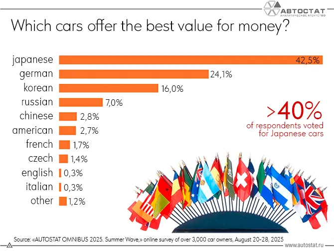 在购车与用车决策中,俄罗斯消费者普遍将价格、品质和可靠性视为最关键的指标。AUTOSTAT于2025年8月对逾3000名车主开展的在线问卷显示,在“最具性价比、品质最好、最可靠的汽车”这一综合评价上,日本品牌以42.5%的得票率遥遥领先,体现出其在可靠性与耐用性方面长期积累的口碑;德国品牌以24.1%位居第二,更被视为兼具质量与驾驶感受的选择;韩国品牌获得16%支持率,凭借相对合理的价格与配置被认为是折中之选。本土俄罗斯品牌虽然在价格上具有优势,但在综合认知上仅获7%的票数,而中国品牌的支持率为2.8%,略高于美国品牌的2.7%,说明在许多俄罗斯消费者心中,中国车在可靠性和品质形象方面仍处于“追赶者”位置。这一调查结果揭示了当前俄罗斯消费者对不同来源品牌的心理分层,为理解其购车偏好提供了重要参考。