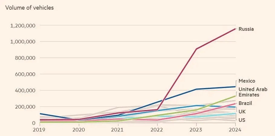 《Russia imposes fees to stem flood of low-cost Chinese cars》https://www.ft.com/content/48cb143e-03ce-4e23-bc6a-7e47d673f1d8