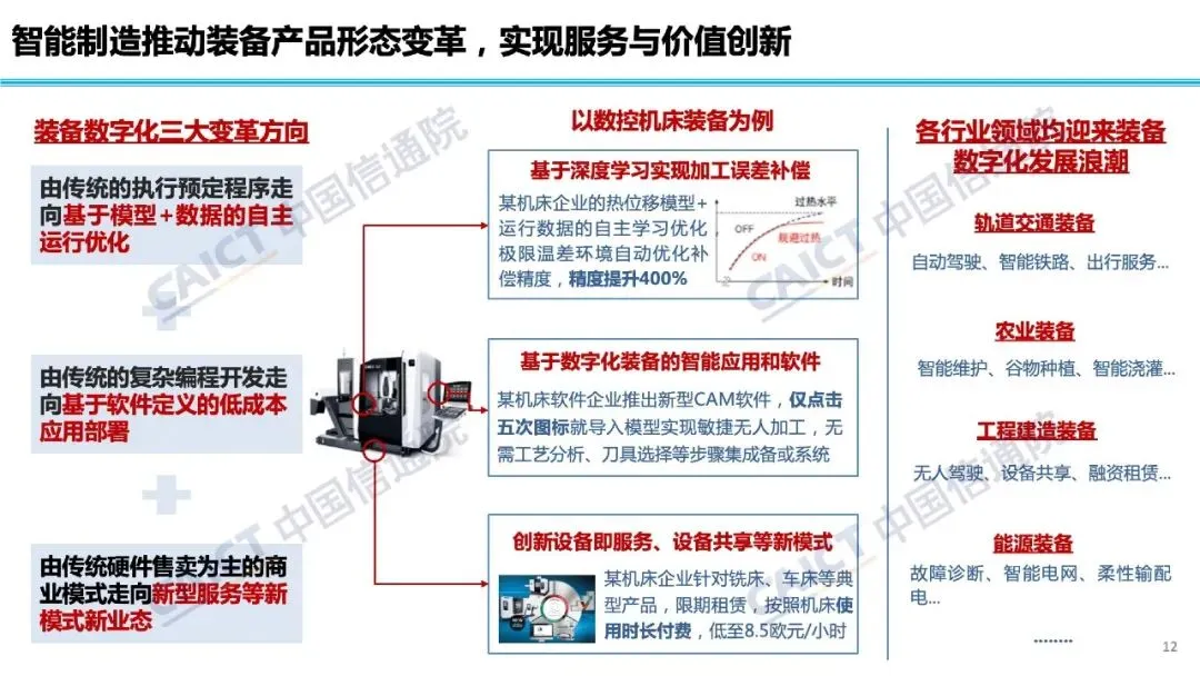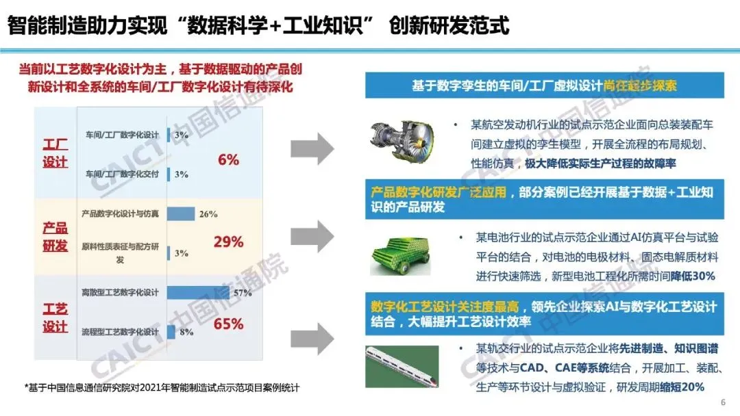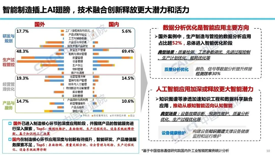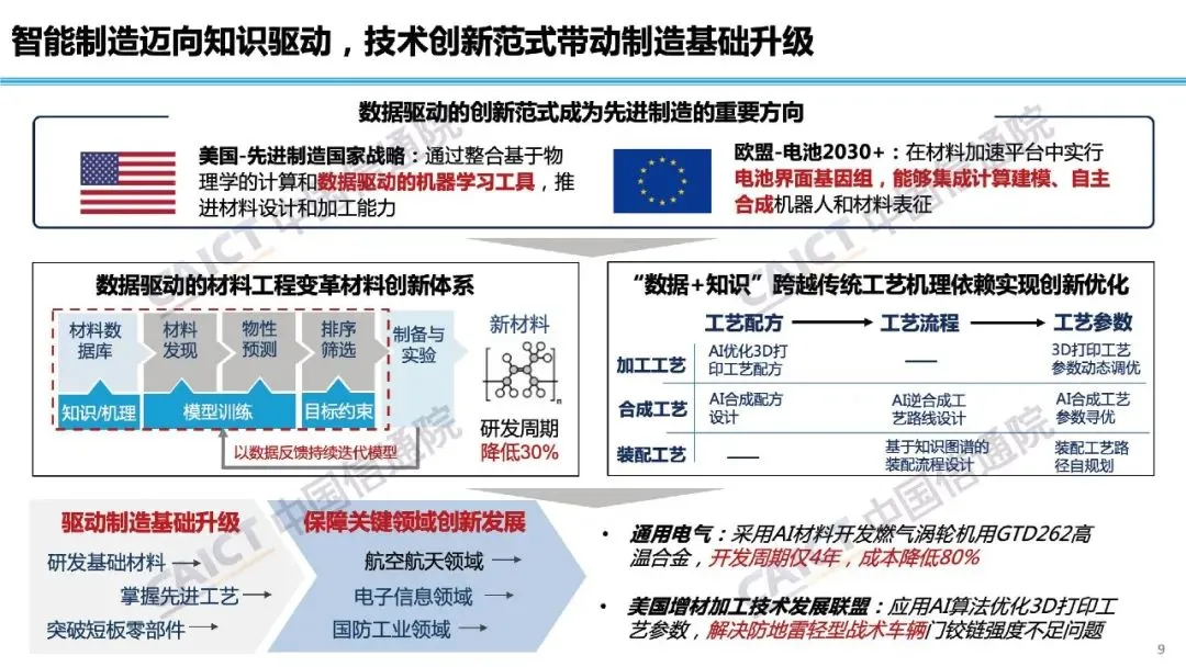 报告指出,智能制造正迈向数据和知识驱动,材料创新和工艺创新正在成为重要方向,在这一过程中,人工智能技术的融入将释放更大潜力和活力。国外在这一领域进展较快,形成了创成式设计、预测性维护、基于知识的生产管理决策等典型场景,我国探索则多集中在生产管理环节,智能研发和产品增值服务仍在探索初期。