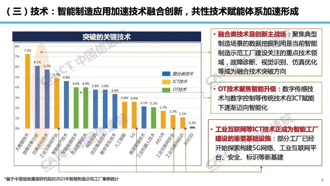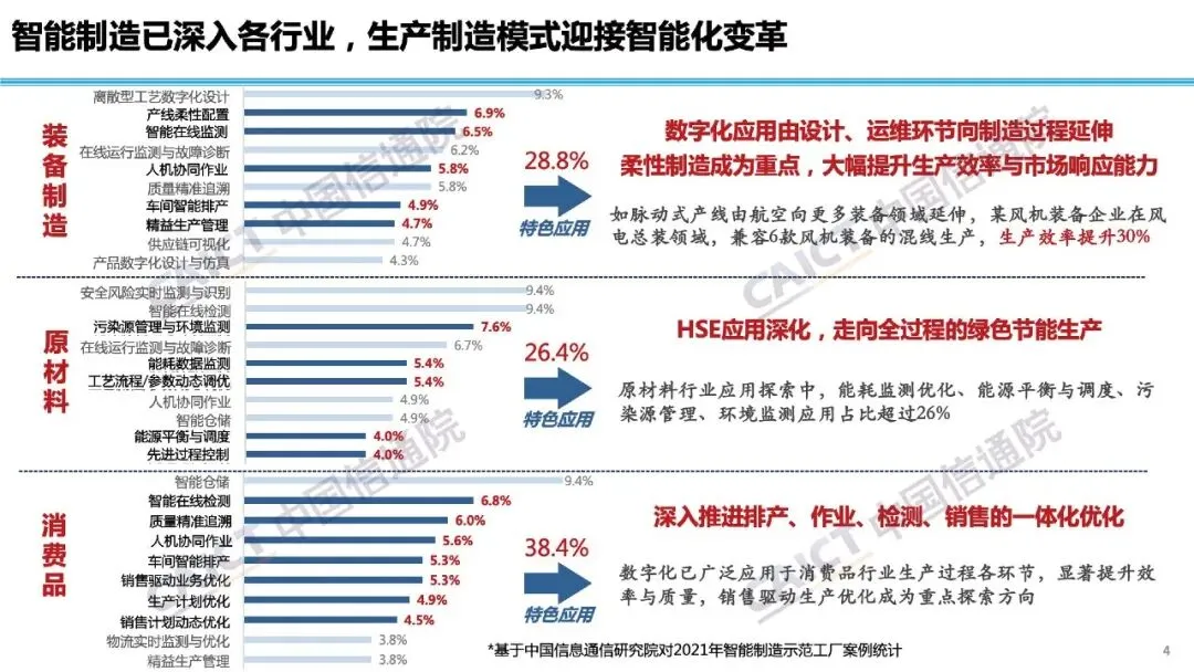 报告分析,我国智能制造应用成效显著,示范工厂的揭榜企业运营成本平均下降18%以上,产品研发周期缩短28%。根据对2021年智能制造试点示范项目分析,当前我国智能制造应用呈现五大特征:一是应用领域主要聚焦生产过程优化,其应用占比在65%以上;二是装备制造、原材料、消费品等细分行业均迎来各具特色的智能化变革;三是智能制造正在变革产业组织模式,推动供应链协同走向社会化生产网络;四是助力实现“数据科学+工业知识”的创新研发范式;五是助力中小企业提升生产管理水平和抢抓采购订单资源,满足中小企业“提能力”“补资源”的双重需求。