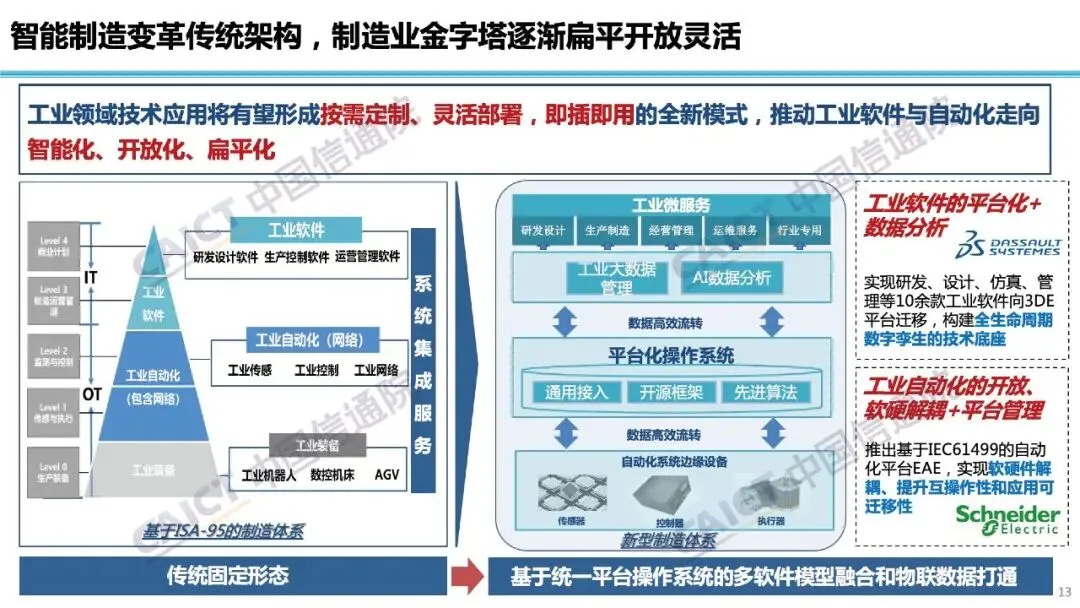 报告展望,智能制造正在变革传统工业架构,制造业金字塔逐渐扁平开放灵活,有望形成按需定制、灵活部署、即插即用的全新模式,推动工业软件和自动化走向智能化、开放化和扁平化,装备数字化进程将不断加速。