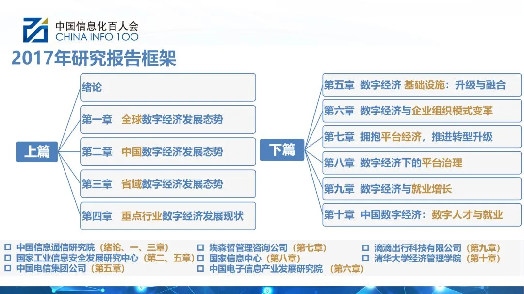 《2017中国数字经济发展报告》由中国信息化百人会联合中国信息通信研究院、国家工业信息安全发展研究中心、中国电信、埃森哲、国家信息中心、中国电子信息产业发展研究院、滴滴出行、清华大学经济管理学院等机构共同承担完成,并共同发布。