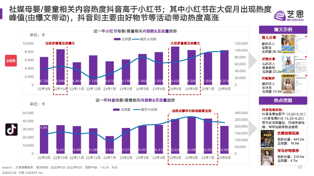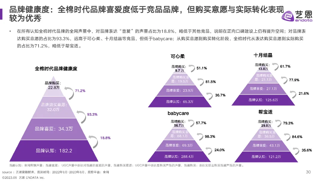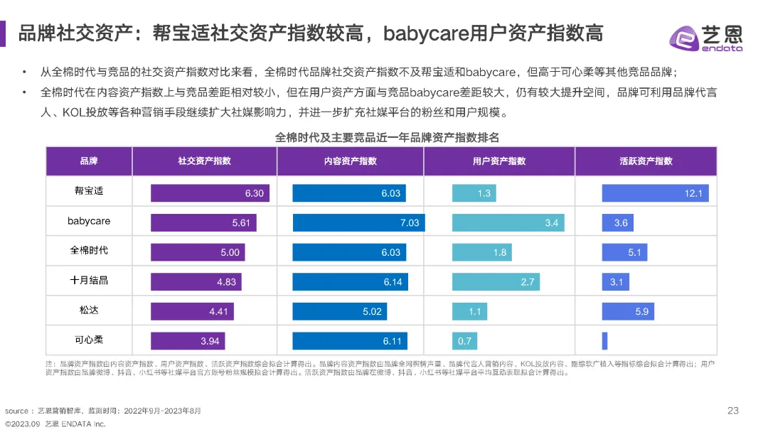 除了全棉时代,帮宝适和babycare在社交资产指数上表现更为出色。这些品牌在社交媒体平台上的内容量和互动量都较高,显示出较好的社交媒体影响力。品牌可以借鉴这些成功案例,加大在社交媒体上的投放和互动,以提升品牌知名度和用户粘性。