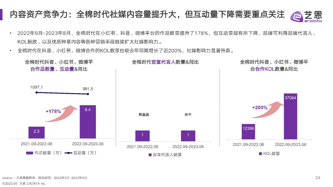在主要品牌表现方面,全棉时代近一年来主要通过电商平台活动和代言人互动等方式获得较高的声量。其在社交媒体平台上投放的内容量同比显著提升,但互动量却有所下降。为了提升品牌的社交媒体影响力,可以考虑运用品牌代言人、关键意见领袖(KOL)的投放以及优质的种草内容等多种营销手段。
