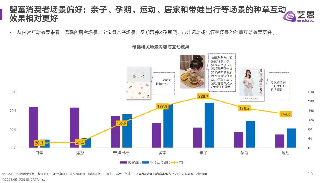 就特定品类而言,棉柔巾的方便、干净、实用等特点仍然是其高内容量和高互动量的卖点。透气性和成分安全等特点也引起了消费者的关注,相关卖点的平均互动热度更高。对于婴童服装而言,柔软亲肤、舒适、吸汗和亲子设计等特点仍然是消费者关注的焦点。透气性、实用性和纯棉材质等卖点的平均互动热度也更高。