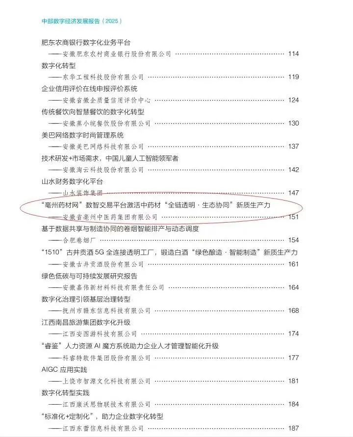 近日,“亳州药材网”数智交易平台入选《中部数字经济发展报告(2025)》。平台以“全链透明·生态协同”为核心,构建覆盖种植、加工、质检、交易等环节的线上枢纽,通过溯源与数据赋能,解决传统交易中信息不透明、质量难保障等问题。