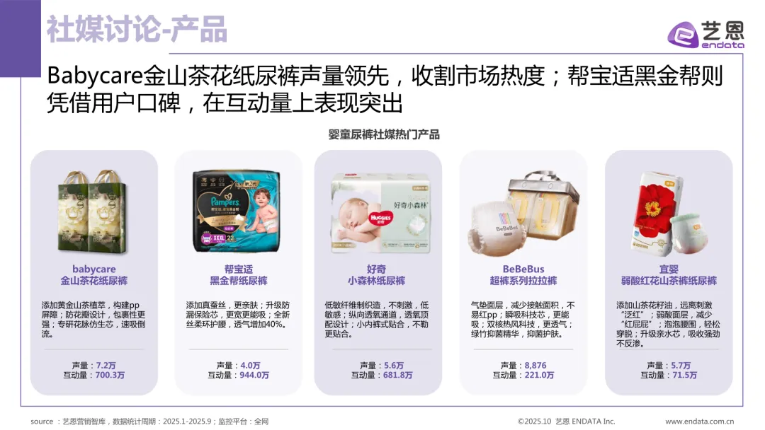 市场竞争层面,国产品牌表现活跃。Babycare、宜婴等凭借产品创新与渠道运营,在社交媒体热度上处于领先地位;