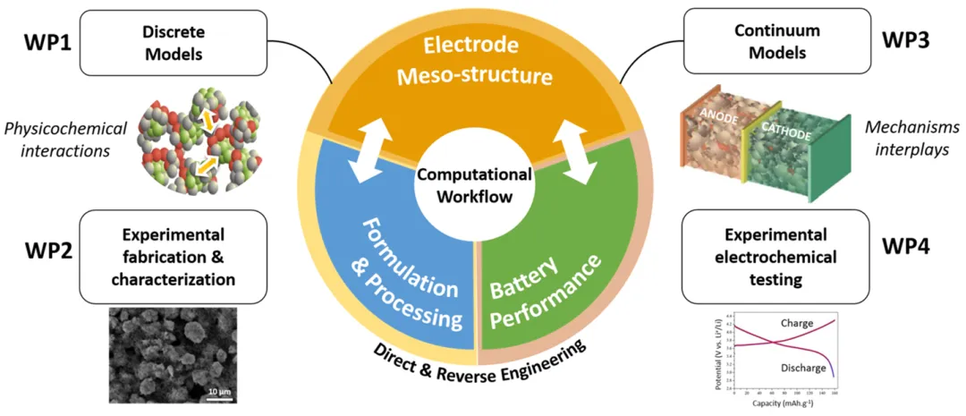 Alejandro A. Franco主导建设了一个名为“ARTISTIC”的项目,该项目受到欧盟地平线2020科研计划的资助。该项目团队建立了一个模拟锂离子电池制造过程并预测其电化学性能的计算平台。该技术平台通过离散元法和粗粒化分子动力学(coarse grained molecular dynamics)模型基于工艺参数预测电极介观结构,再基于连续介质模型利用介观结构数据预测电池宏观上的电化学性能表现。可以看出该项目在尝试建立一个材料-工艺-(极片)结构-性能的多尺度仿真平台[14]。
