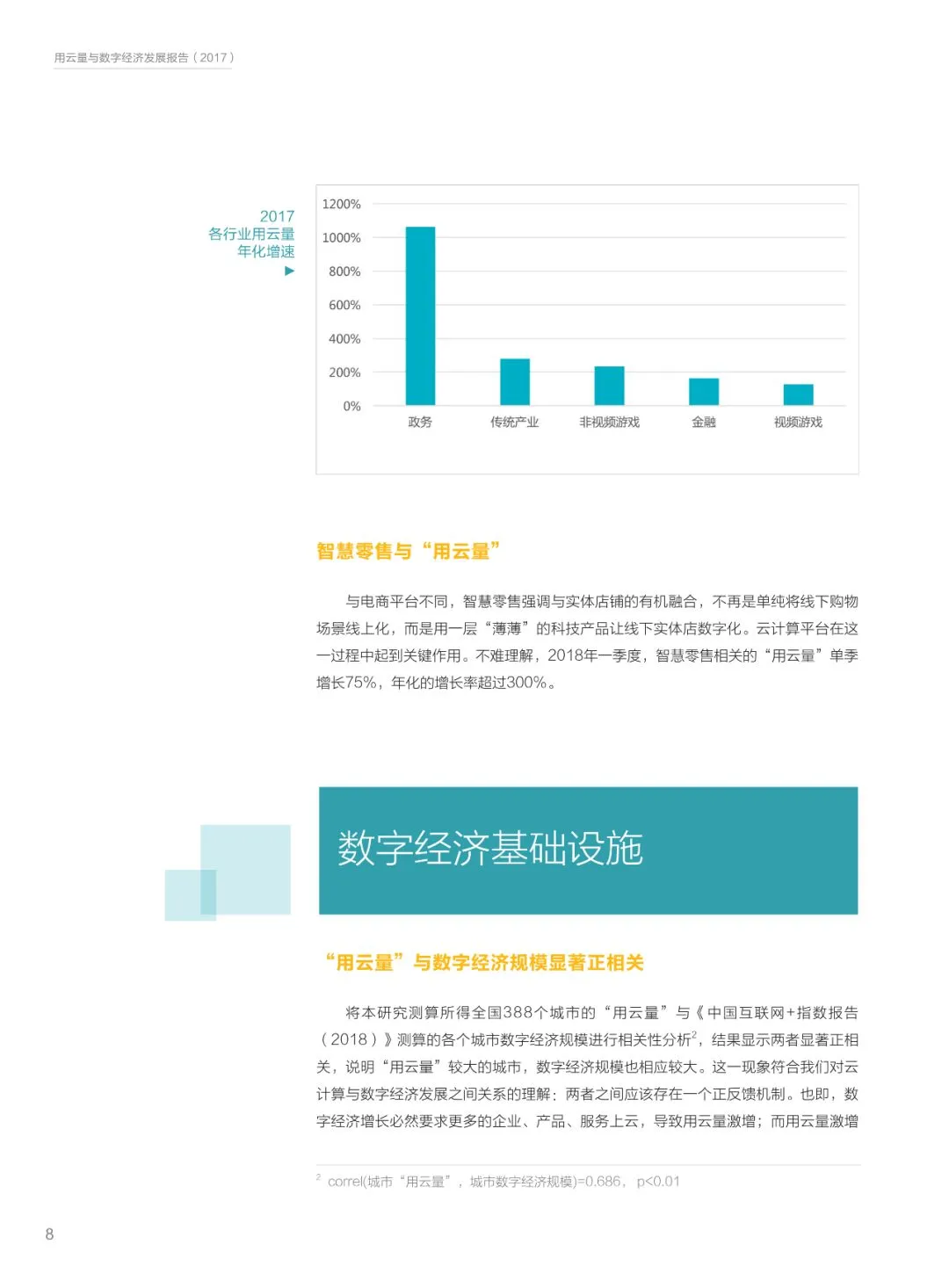 从具体内容来看,报告展现了2017 年全国“用云量”快速增长的特点:2017 年下半年全国“用云量”总量较上半年环比增长66.5%,年化增长率 133.1%。2018一季度增速再上台阶,较去年同期同比增长138.6%。