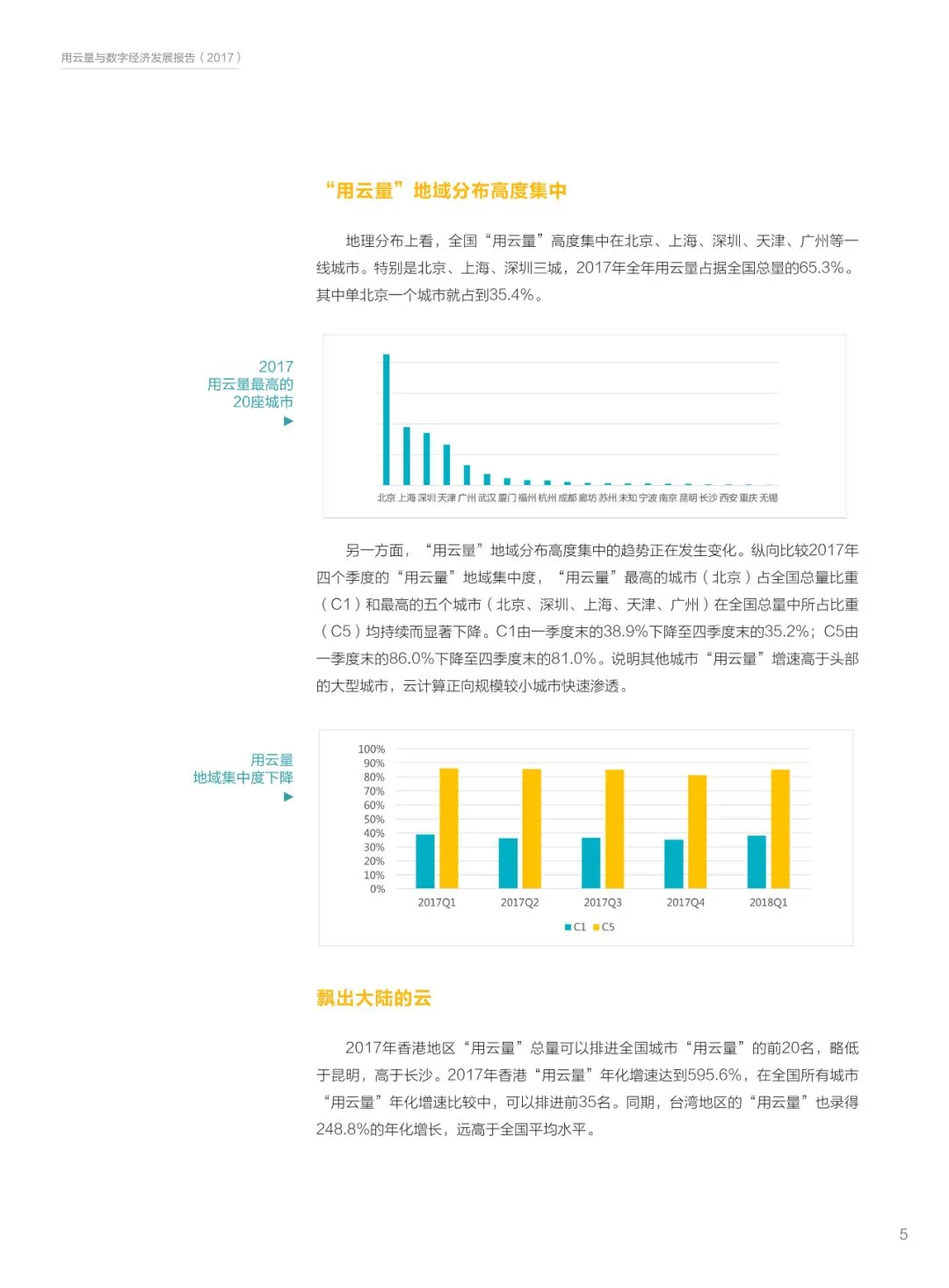 具体到地域分布,“用云量”则高度集中在北京、上海、深圳、天津、广州等一线城市,且正向规模较小的城市快速渗透。值得注意的是,2017 年香港 “用云量”年化增速达到 595.6% ,也可以排进全国城市“用云量”的前 20 名。