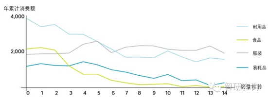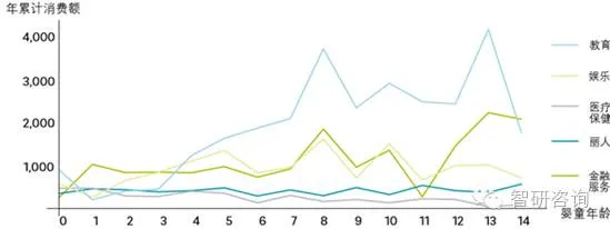 婴童食品、易耗品、耐用品的消费主要集 中在0-3岁,其中的主要品类(如奶粉、纸尿 布及童车童床)的目标客户群是0-3岁的婴 童;服装作为各年龄婴童的必需品,其销售额 会保持在一个较为稳定的水平; - 教育服务和金融服务占母婴童市场的比重 会随着婴童年龄的增长持续上升。婴童消费与家庭收入同样密切相关,即家庭 收入水平越高,服务消费占比越大,其中教 育消费占最大比例。2015年,每个城镇婴童的消费达11,197元,其中约39%为服务类消 费,而高收入家庭的平均消费达21,258元, 其中服务类消费的比重高达49%。