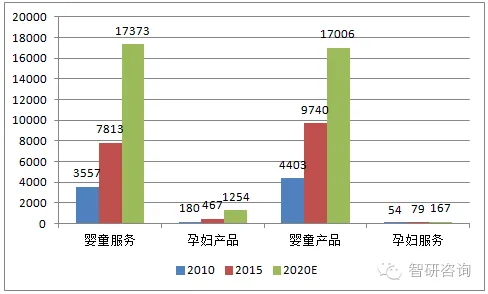 中国母婴童市场于2009年前发展起步,2010 年以来一直呈爆发式增长态势,整体市场规 模由2010年的8千亿元增长至2015年的1.8万亿元,年均增长率达到17%。其中,婴童产品及服务占据了整体市场的大半壁江山,二者之和占比超过90%。预计受出生人口增长和消费能力 升级的推动,未来五年,中国母婴童市场需 求仍将持续处于上升态势,预计将以每年 15%的速度增长,2020年的整体市场规模接 近3.6万亿元。其中,婴童产品虽然绝对体量 占比仍然较高,但由于经历了2012-2014年 的井喷期,其市场渗透率高于其余子市场, 因此2015-2020年期间的增速将逐步放缓。 而其余三大品类,即婴童服务、孕妇产品和孕妇服务的增速都将有所提高。