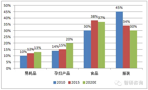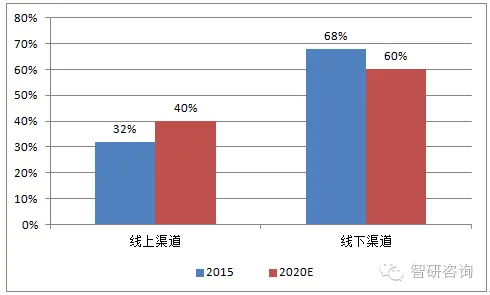 从母婴童市场销售渠道来 看,到2020年,线上渠道占比预计将由2015 年的32%增至40%,虽然增长迅速,但整体 份额仍不敌线下渠道。线下渠道仍将是母婴童产品市场的主要销 售渠道:消费者购买母婴童产品时,对于渠 道可信度的要求较高,同时更加关注产品质 量,这使得线上难以在短期内取代线下成为 主流渠道;另一方面,线下专业母婴零售渠 道,如母婴专卖店,凭借在专业化的产品及 服务等方面的优势,占比不断上升;受易耗品、服装、食品等线上消费增加的驱 动,未来整体线上渠道占比将有所提高:易耗 品、服装及食品等产品品类的部分细分类别标 品化程度较高,且多为重复购买,使得线上渠 道在价格配送等方面的优势凸显。