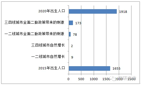 受全面二胎政策的影响,2020年出生的人口数 量预计将比2015年增加约250万人。由于抚养 婴童成本较低,且女性受教育程度相对较低( 统计数据显示,女性受教育程度越低,生育一 胎以上的意愿越强),三四线城市家庭生育二 胎的意愿更强。加之人口基数大,因此,三四 线城市出生人口数量增势将尤为明显,预计占 总增长的80%以上。