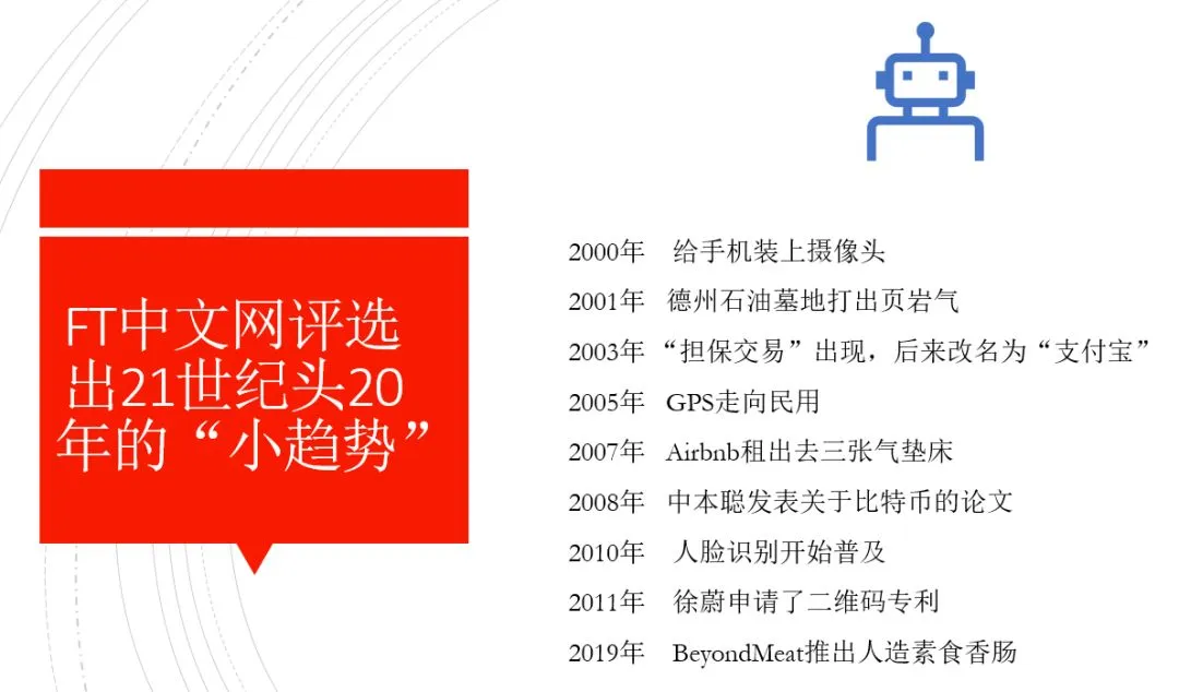 上图是FT中文网评选出的21世纪头20年发生的小趋势,这些小趋势我们都曾亲身经历过。之所以要关注它们,其实跟我们所处的时代相关。进入信息时代后,有人认为信息的获取已经越来越容易,但这种观点其实是错误的。相反,当我们进入信息时代,我们的信息反而更加闭塞。