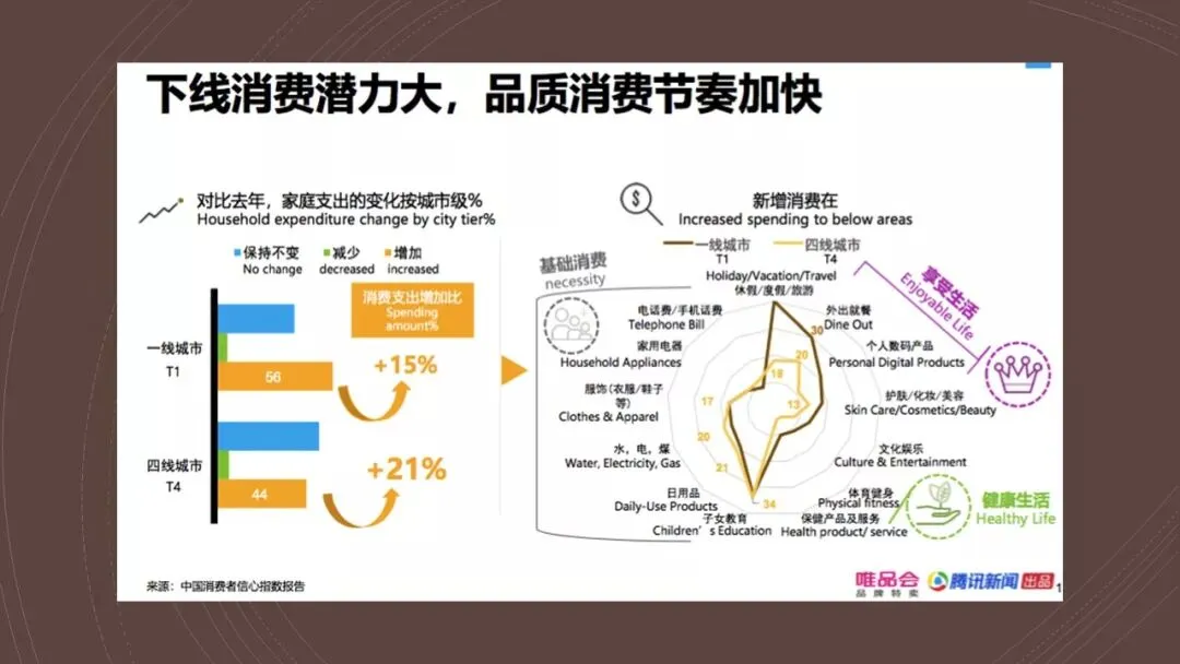 从唯品会的报告来看,第一,一线城市的新增消费主要表现在高端消费,即享受型消费,比如去马尔代夫、南极旅游。第二,性价比的重要性日渐凸显。其背后的原因是中国有强大的生产能力和更高的消费需求。当前,国人已经不再满足那些50分的伪劣产品,但也没有准备好购买99分的奢侈品,而强烈要求获得85分的优良产品。中国未来的红利不是人口红利,也不是全球化红利,而是“苟且红利”,即找到一个做事马马虎虎、苟且发展的竞争对手,把他打败,那么你的红利就来了。第三,三、四线城市的育儿消费增长速度比一线城市更快,因为一线城市的养育成本太高,限制了人们的生育,下线城市则要低很多。