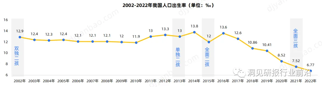 • 2002-2022年,我国出生率呈波动下降趋势。在2015年全面二孩放开后,2016年出生率有明显上升,成为近20年增幅最快的一年。然而,自2016年以来,我国的出生率一直保持下跌态势,直到2022年跌幅超过50%。