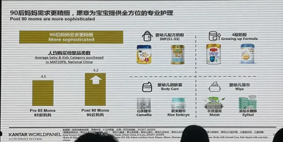 其次, 从人均购买品类数量来说,85前的妈妈平均购买4.5个品类,而90后妈妈是5.2个品类,她们也开始购买一些有特殊成分的产品。